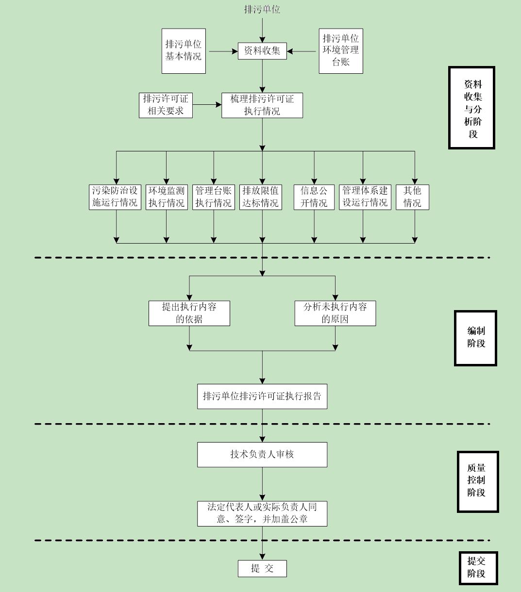 本标准根据资料收集与分析、编制报告、质量控制、提交四个阶段给出了执行报告的编制流程。