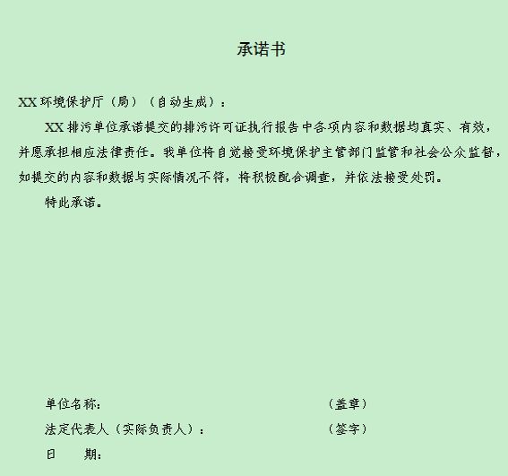 排污单位应对提交的排污许可证执行报告中各项内容和数据的真实性、有效性负责,并自愿承担相应法律责任。本次要求排污单位应作出书面承诺,承诺自觉接受环境保护主管部门监管和社会公众监督,如提交的内容和数据与实际情况不符,将积极配合调查,并依法接受处罚。承诺书应作为纸质版执行报告的内容一并上报。